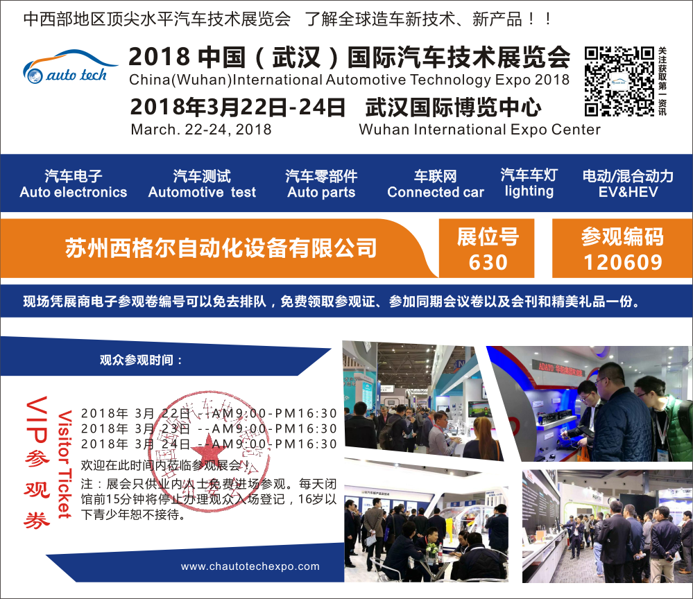 2018中國(guó)(武漢)國(guó)際汽車測(cè)試測(cè)量技術(shù)展覽會(huì),2018年3月22-24日,武漢國(guó)際博覽中心B2630,期待您的光臨指導(dǎo),謝謝!